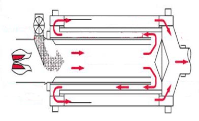 高溫?zé)峥諝馀c濕物料一起進(jìn)入中心筒,然后回轉(zhuǎn),沿中間環(huán)形通道流動(dòng),再次折回,通過(guò)外環(huán)形通道,至干燥圓筒的排出口。各通道內(nèi)的物料在高溫氣流壓力下輸送,并在懸浮狀態(tài)下干燥,通道內(nèi)還有葉片來(lái)攜帶散落的物料。微小碎料幾乎與空氣流同速通過(guò)干燥機(jī)。中間和外環(huán)形通道內(nèi)的較濕重的物料由料流中落下,但由于干燥筒的轉(zhuǎn)動(dòng)重新被葉片帶起,返回氣流中,不斷地處于干燥介質(zhì)的包圍之中