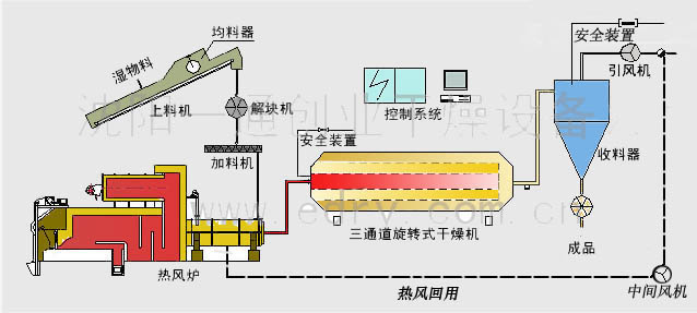 濕物料推入上料機(jī),在上料機(jī)出料口前均料器將物料均勻化,解塊機(jī)將物料打散,松散的物料通過(guò)上料機(jī)送入加料口,被高溫?zé)釟饬魑敫稍餀C(jī)內(nèi)進(jìn)行干燥;干燥后的物料隨氣流進(jìn)入排料系統(tǒng),混入的雜物沉積到沉積裝置中定期排出,經(jīng)收集器料風(fēng)分離后,干物料由閉風(fēng)出料器排入冷卻系統(tǒng);冷卻后的干料經(jīng)閉風(fēng)出料器進(jìn)入打包機(jī)打包(或造粒壓塊磨粉等)。從收集器排出的尾氣排入大氣,或根據(jù)用戶條件,部分尾氣循環(huán)使用,以提高熱效率。